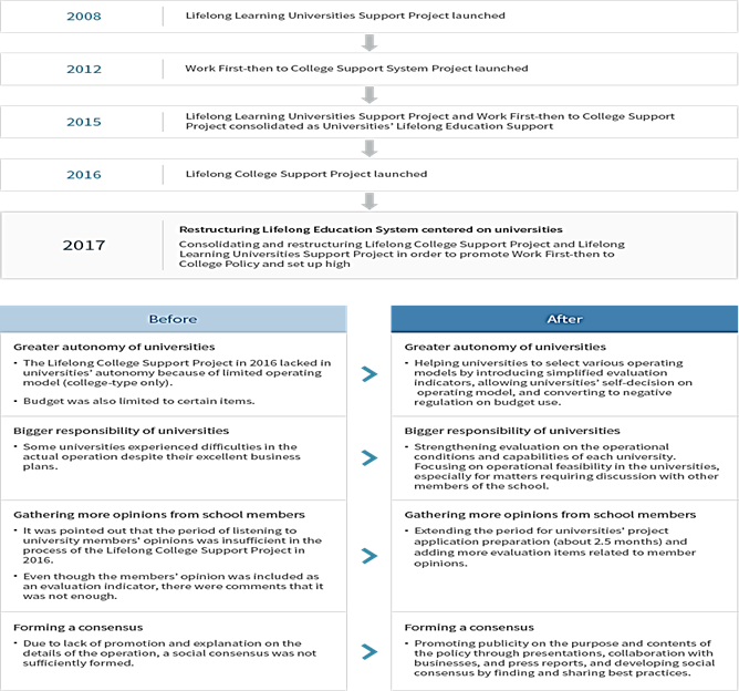 It was introduced in order to promote Work First-then to College Policy and set up higher education system that is friendly to adult learners by consolidating and restructuring Lifelong College Support Project and Lifelong Learning Universities Support Project.