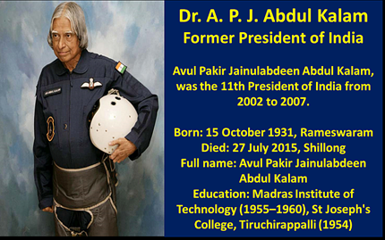 Avul Pakir Jainulabdeen Abdul Kalam better known as A. P. J. Abdul Kalam (/ˈæbdʊl kəˈlɑːm/) 15 October 1931 – 27 July 2015), was the 11th President of India from 2002 to 2007. A career scientist turned statesman, Kalam was born and raised in Rameswaram, Tamil Nadu, and studied physics and aerospace engineering. He spent the next four decades as a scientist and science administrator, mainly at the Defence Research and Development Organisation (DRDO) and Indian Space Research Organisation (ISRO) and was intimately involved in India's civilian space programme and military missile development efforts. He thus came to be known as the Missile Man of India for his work on the development of ballistic missile and launch vehicle technology. He also played a pivotal organizational, technical, and political role in India's Pokhran-II nuclear tests in 1998, the first since the original nuclear test by India in 1974.